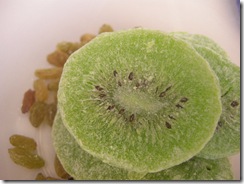 Snack was dried kiwi (2) and dried green grape raisins (2)
